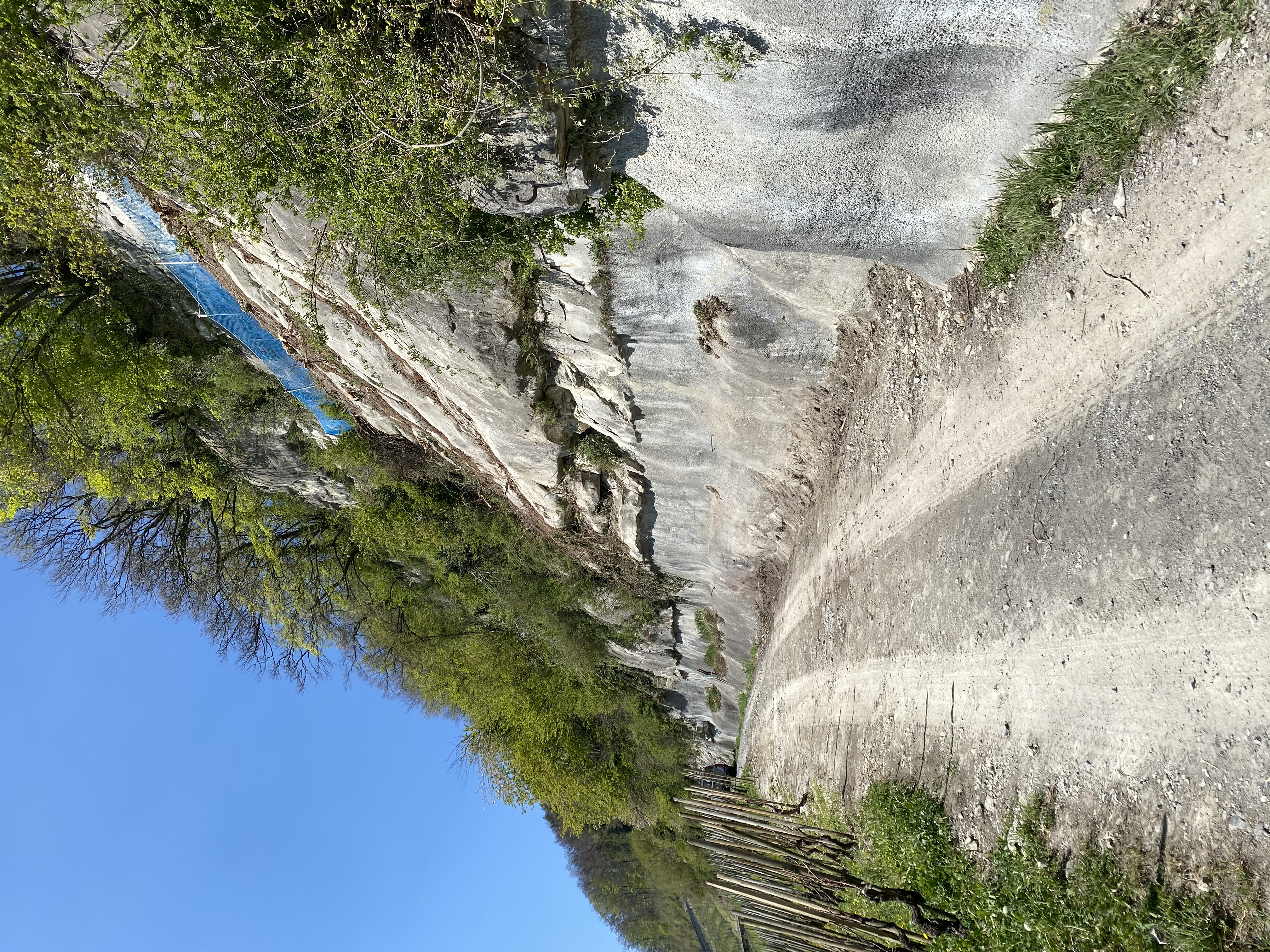 Nach dem Felssturz oberhalb des Grüeziwegs vom 5. Februar 2021 musste der beliebte Wanderweg aus Sicherheitsgründen gesperrt werden. Mit diversen Sofortmassnahmen und einer kontrollierten Entfernung der verbleibenden Wandscheibe wurde der Gefahrensituation begegnet. Zuerst wurde durch Höhenkletterer loses Material in der Felswand entfernt und anschliessend mit drei kontrollierten Sprengungen die Wandscheibe entfernt. Zuletzt wird nun im oberen Bereich ein Drahtgeflecht-Zaun als Absturzsicherung und Materialrückhalt installiert, der das jetzige blaue Netz ersetzt.